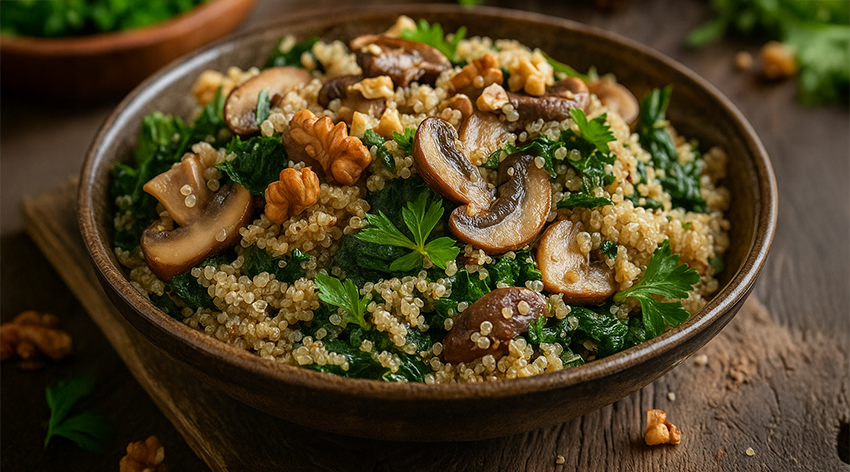 Wenn Waldaromen auf zarte Blattpower treffen: Unser Rezept für eine Spinat-Pilz-Quinoa-Pfanne bringt die leckersten Aromen auf Ihren Teller!
